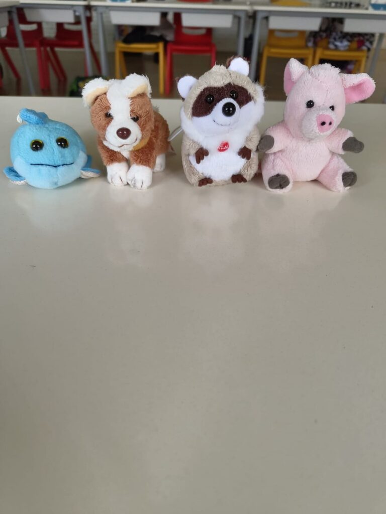 São brinquedos de peluche – um cão, uma baleia, um guaxinim e um porco – que se juntaram à nossa sala de aula como parte de um novo método para incentivar o comportamento positivo. Estes amigos fonhos ajudam a melhorar a atenção, a participação e o respeito pelas regras da turma. Quando os alunos são participativos, empenhados e respeitadores, ganham a oportunidade de ter um dos amigos sentado na sua secretária durante toda a aula de inglês seguinte.