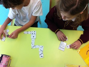 Hoje, no seguimento do tema “Contagens”, que nos encontramos a trabalhar na área da matemática, construímos peças de dominó. O jogo consistia em que durante a construção, o valor das peças não ultrapassasse o número 5. Podemos desta forma iniciar a decomposição de números, brincando.
