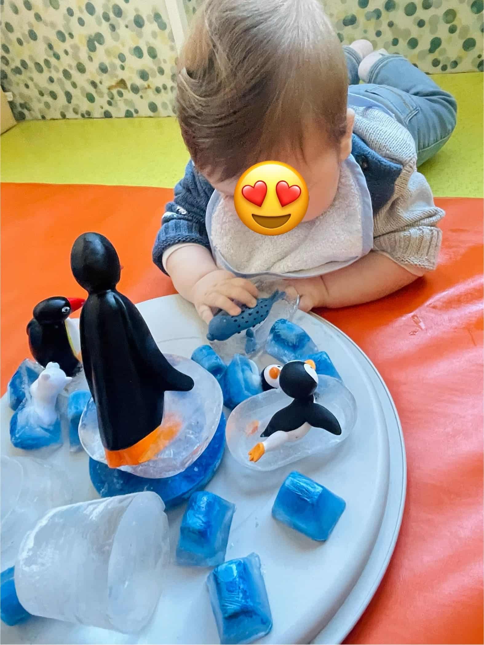 No inverno, o berçário pode oferecer uma atividade divertida e educativa para os bebés explorarem o gelo e os pinguins. Para esta atividade, os adultos colocam pequenos pinguins de plástico dentro de recipientes com água e deixam congelar, criando blocos de gelo com os pinguins presos no seu interior. Quando o gelo está pronto, os bebés têm a oportunidade de explorar as diferentes texturas e temperaturas ao tocar e manipular o gelo, enquanto observam o derretimento gradual.