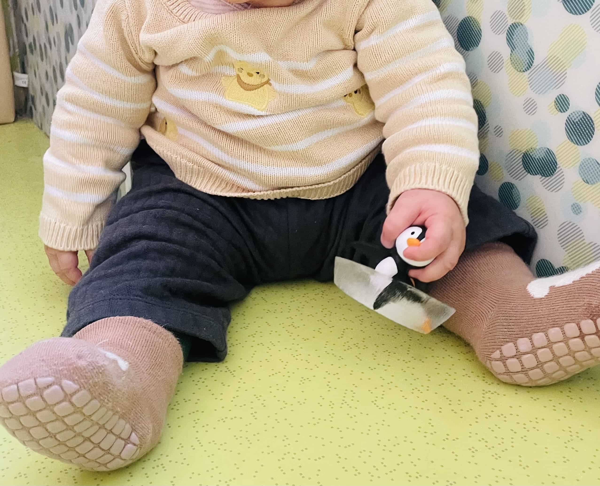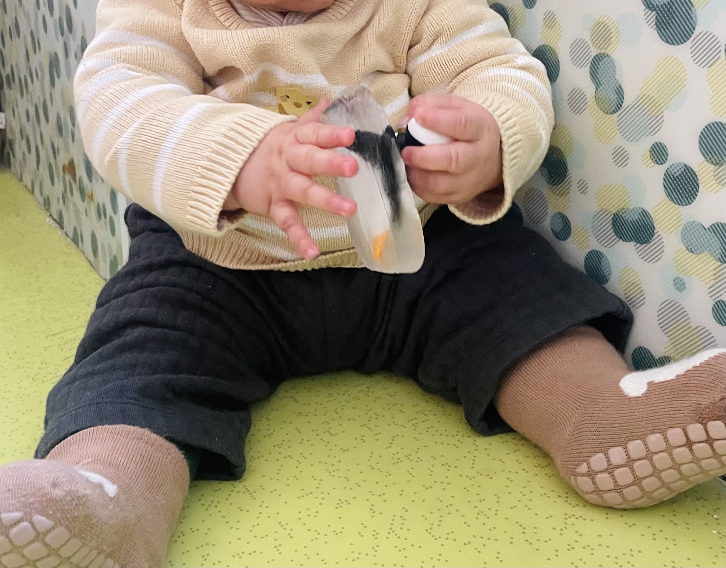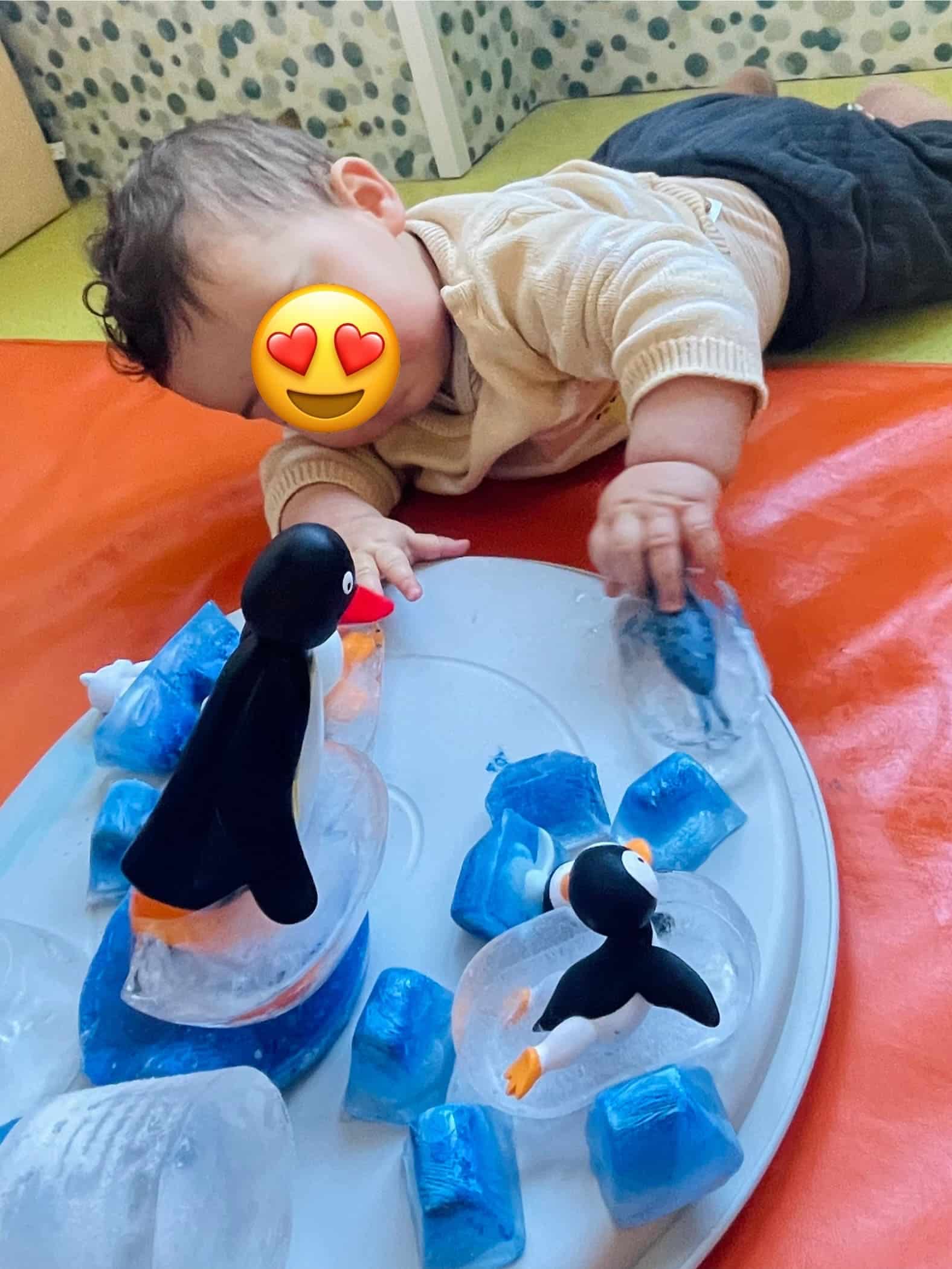 Durante a exploração, as cuidadoras incentivam os bebés a observarem e tocarem o gelo, estimulando a curiosidade e o desenvolvimento sensorial. Além de tocar no gelo frio, os bebés desenvolvem a coordenação motora ao tentar agarrar os pinguins e explorar o ambiente de forma lúdica. A atividade